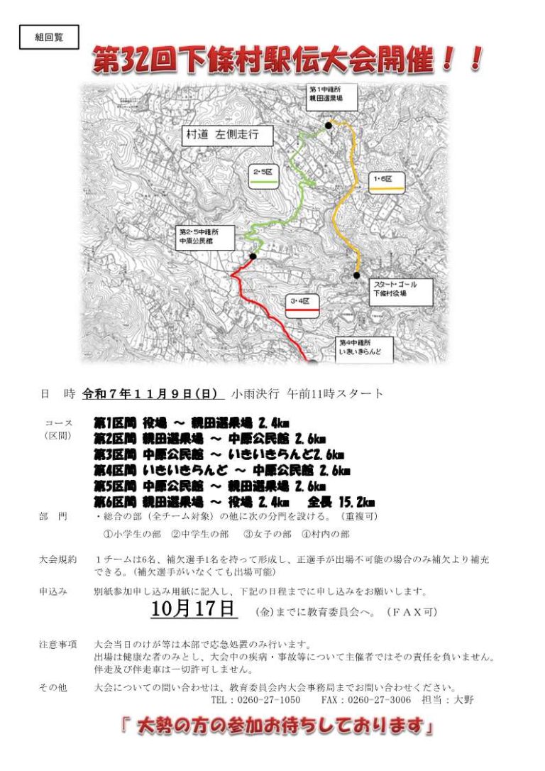 2025.10.10第32回下條村駅伝大会開催!!令和7年11月9日(日)午前11時に第32回下條村駅伝大会を開催します。詳細につきましては、こちらをご覧ください。大勢の方のご参加をお待ちしております。 パンフレットおよび参加申込書はこちら 日時 令和7年11月9日(日)少雨決行 午前11時スタート コ…記事を読む -