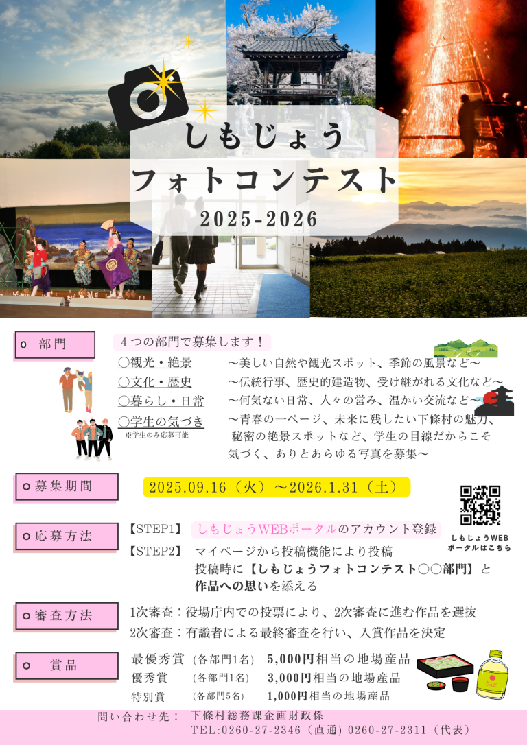 2026.02.19【2月28日まで期間延長】しもじょうフォトコンテスト2025-2…※募集期間を延長しました!当サイト内「みんなの投稿」にてしもじょうフォトコンテストを開催しています!皆様のご応募お待ちしております!チラシはこちらから確認できます。 ○部門 4つの部門で募集!各部門一人3点まで応募可能!※下條村内で過去3年位の間に撮影された未発表の…記事を読む -