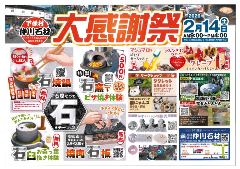 2026.01.19大感謝祭!創業105周年をむかえました、下條村、仲川石材。 毎年恒例の『大感謝祭』を、 2月14日(土)9:00~16:00、 下伊那郡下條村睦沢220にて開催します。 盛り沢山の楽しい事一杯。 是非お越しください。記事を読む -