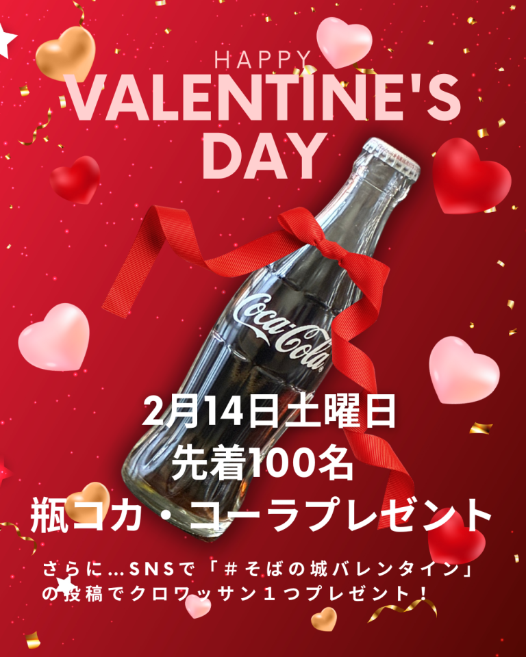 2026.02.08バレンタインはそばの城へ!🎁 バレンタイン限定イベントのお知らせ 🎁 2月14日(土)は、そばの城から日頃の感謝を込めて… ✨ 先着100名様に「瓶コカ・コーラ」をプレゼント! ✨ 昔ながらの瓶コーラをキンキンに冷やしてお待ちしております。 お渡し場所は 中央レジ です。 さらに…! Inst…記事を読む -