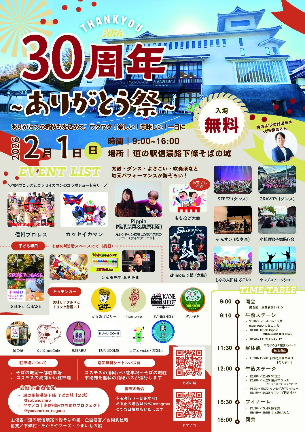道の駅信濃路下條はおかげさまで30周年✨ 「感謝」「楽しさ」「ワクワク」が詰まった特別な一日をお届けします! 📅 2月1日(日) 9:00~16:00 📍 道の駅信濃路下條 ✅ 入場無料 ✅ 信州プロレス・ヒーローショー・音楽ライブ・ダンス・地元吹奏楽・和太鼓・キッチンカーなど盛りだくさん! 家族みんなで楽しめるイベントです😊 👉 詳細は画像をご覧ください