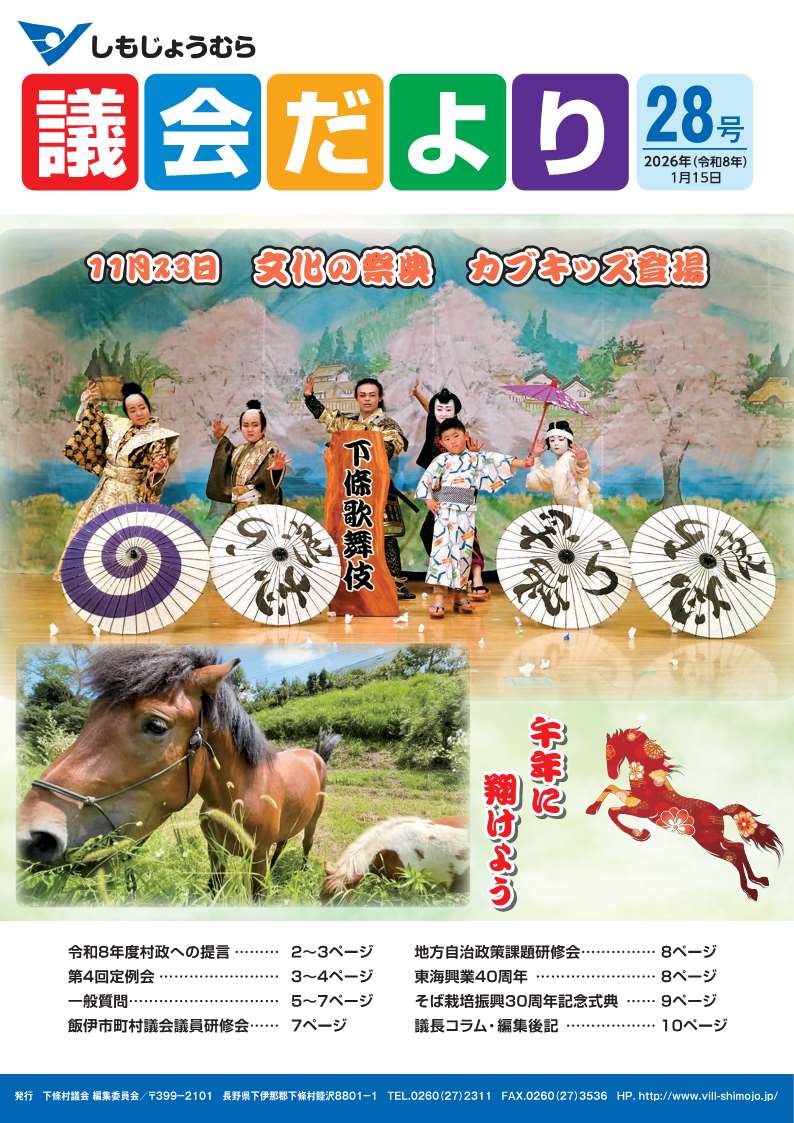 議会だより28号(令和8年1月15日発行) 内 容2~3ページ村政への提言4~7ページ第4回定例会議会概要8ページ祝 東海興業下條工場設立40周年9ページ下條村そば栽培30周年記念式典10ページ編集後記 情報提供元:村ウェブサイト