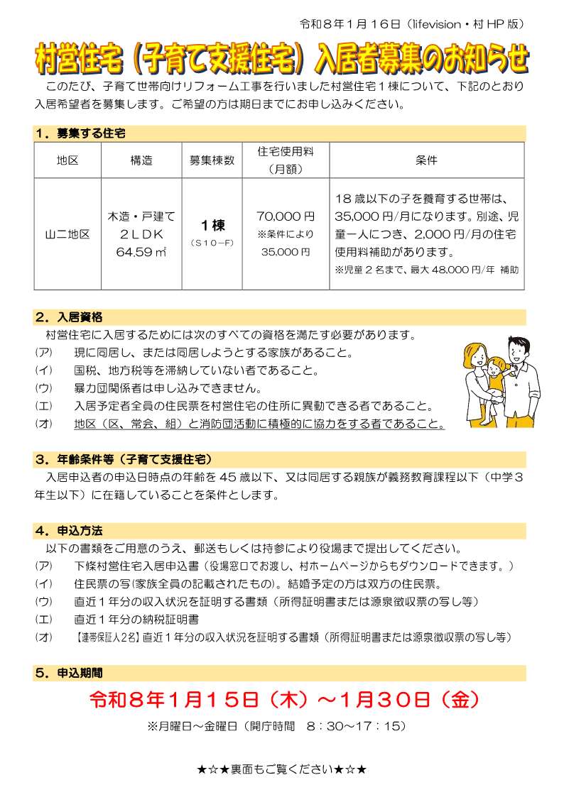 村営住宅(子育て支援住宅)入居者募集のお知らせ
