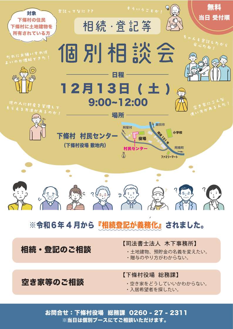 相続・登記等個別相談会 12月13日(土)午前9時~12時まで(受付は11時30まで)、下條村 村民センターにて司法書士および役場総務課による「相続・登記等個別相談会」が開催されます。ご希望の個別ブースにてご相談いただけますので、ぜひこの機会にお越しください。 参加…