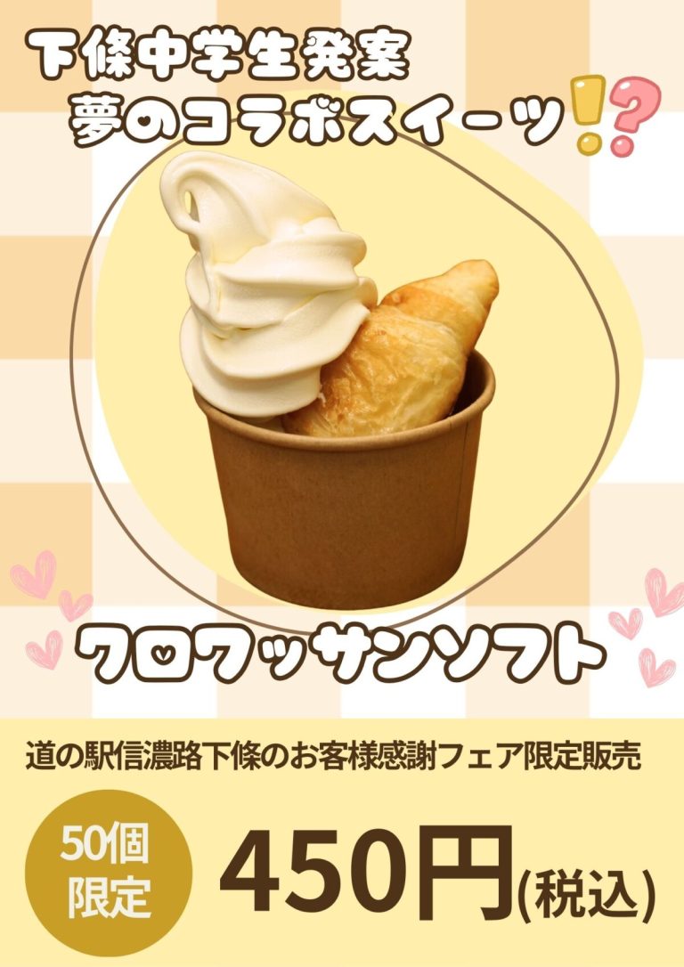 🎉【限定販売のお知らせ】🎉 令和7年8月30日開催の「道の駅信濃路下條 お客様感謝フェア」にて、下條中学校の中学生が「村づくり意見発表会」にて提案した新スイーツ「クロワッサンソフト」を限定販売いたしま…