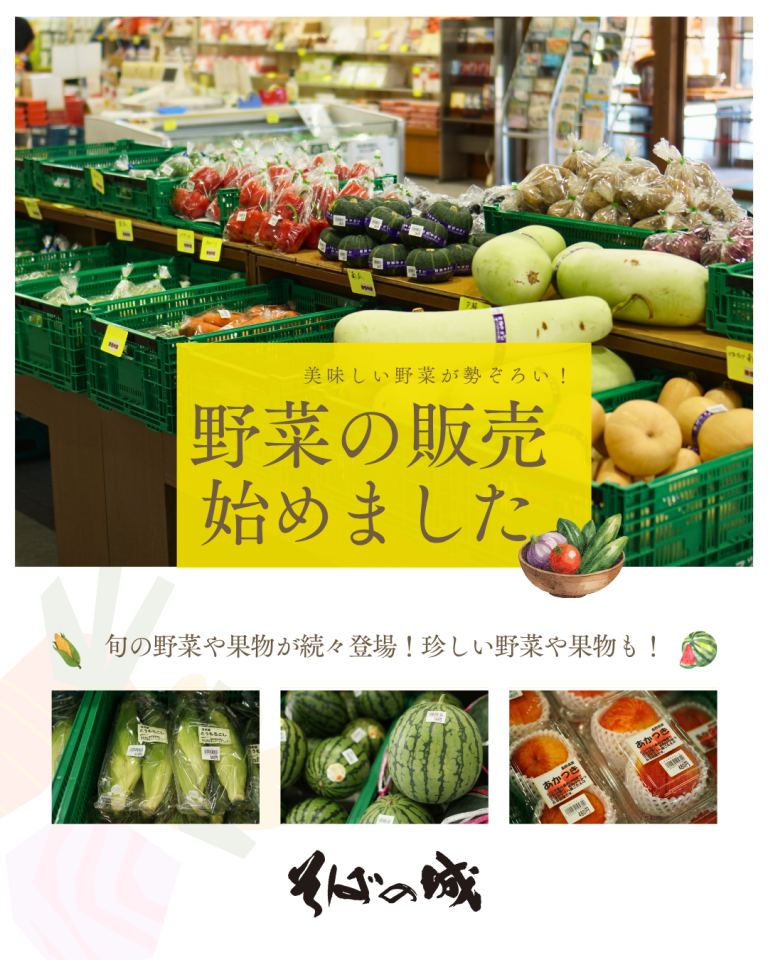 8月2日(土)より野菜の販売を始めました!地元の野菜を中心に旬の果物や面白い野菜も! こんな暑い日には「そばの城」で涼みながらお買い物はいかがでしょうか?