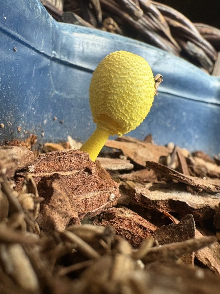 黄金絹唐傘茸【コガネキヌカラカサダケ】 リビングにある観葉植物の鉢植えから出て来ました♪ 通称「お釈迦様のきのこ」「幸運のきのこ」と呼ばれています