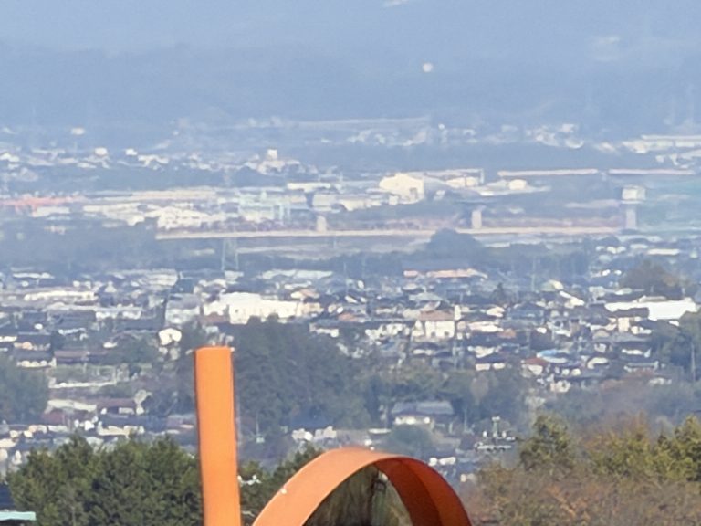 下條村阿知原の散歩道から見える遠方のリニアの橋脚