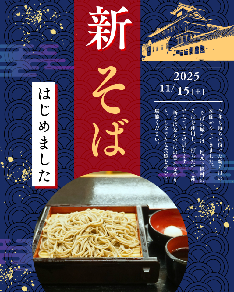 今年も待ちに待った新そばの季節がやってきました。 そばの城では、地元下條村のそばを使用し、打ちたて・茹でたてでご提供します。 新そばならではの豊かな香りと、しなやかな食感をぜひご堪能ください。