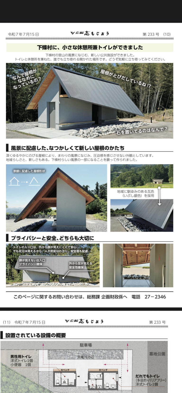 2025-0715-1405 (↑記事はこちらからみれます) 今月発行の広報誌もじょうに、上野原多目的広場トイレの記事が掲載されていました。 単なるトイレではないようです…!