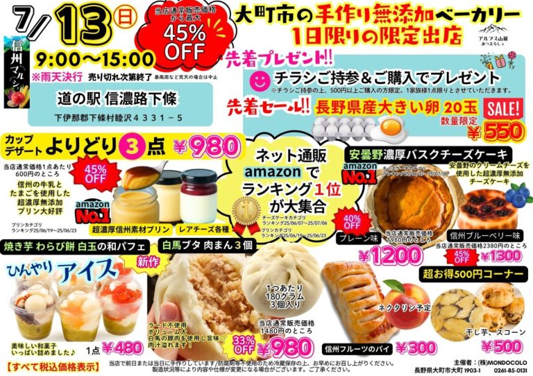 道の駅 信濃路下條に大町市から手作り無添加ベーカリーがやってきます! 大人気のバスクチーズケーキをはじめ様々なスイーツが盛りだくさん! 7月13日(日)は道の駅にぜひお越しください!