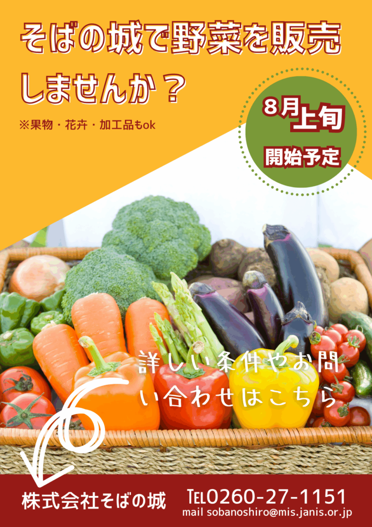 🥕🍎 出品者募集のお知らせ 🍞🌽 ~地元の魅力を一緒に届けませんか?~ そばの城では、地元の新鮮な野菜や果物、こだわりの加工品などを販売する出品者を募集しています。 地域の皆様の「おいしい」「すばらし…