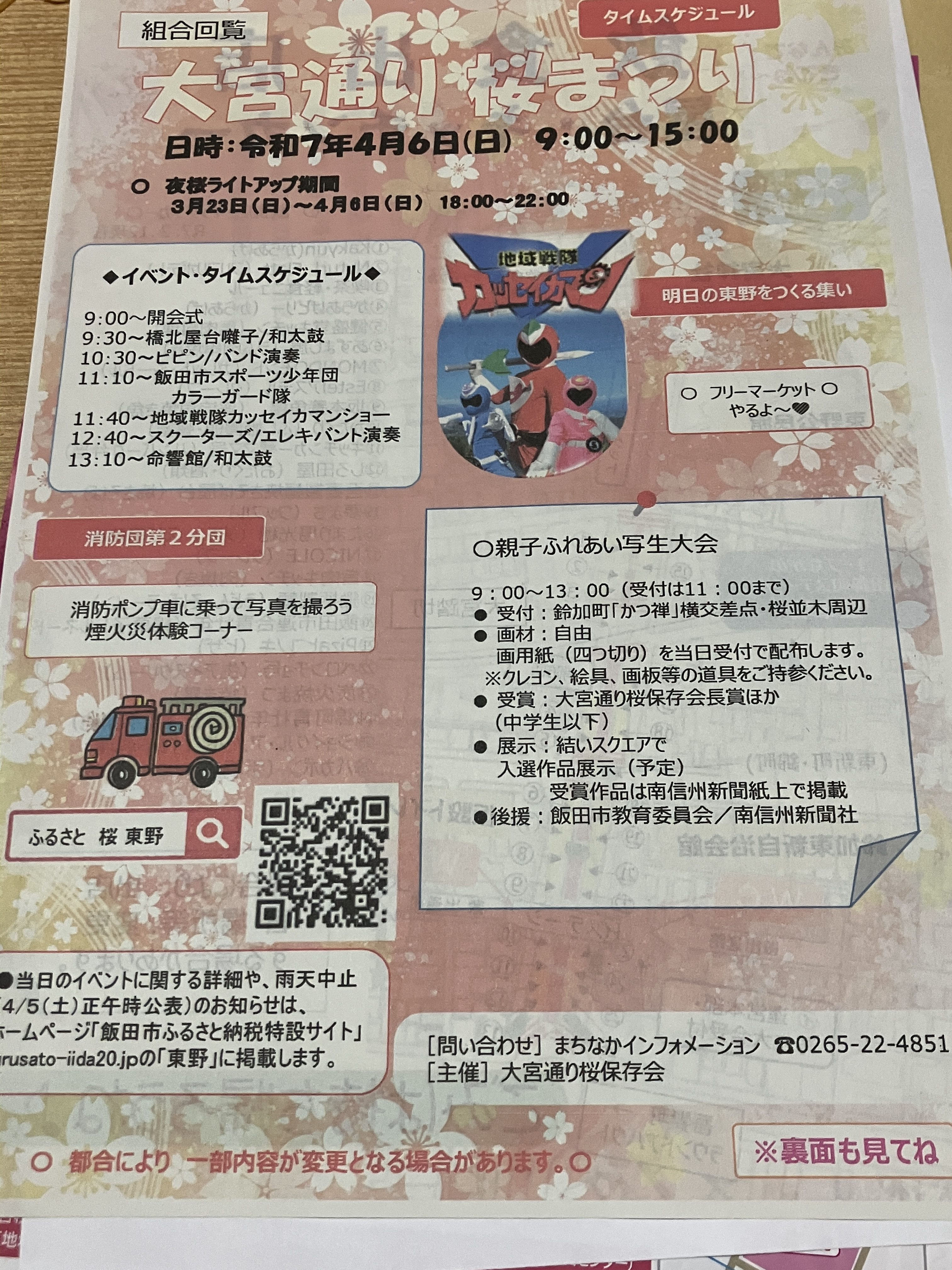 いよいよ桜も開花!4月6日は飯田市大宮桜祭りにカッセイカマン出動します!毎年お呼びいただきましてありがとうございます😊雨が降ったり、桜の開花がしなかったり、さまざまな思い出のあるイベントですが、今回は桜の綺麗な時期になりそうです。みんな大宮通りに集合!
