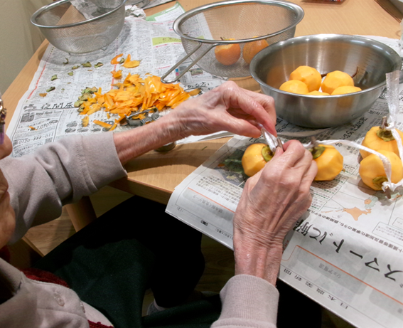 グループホーム北又の杜です。柿むきをしました。皆さん昔取った杵柄で、スルスルとむいてくれました。