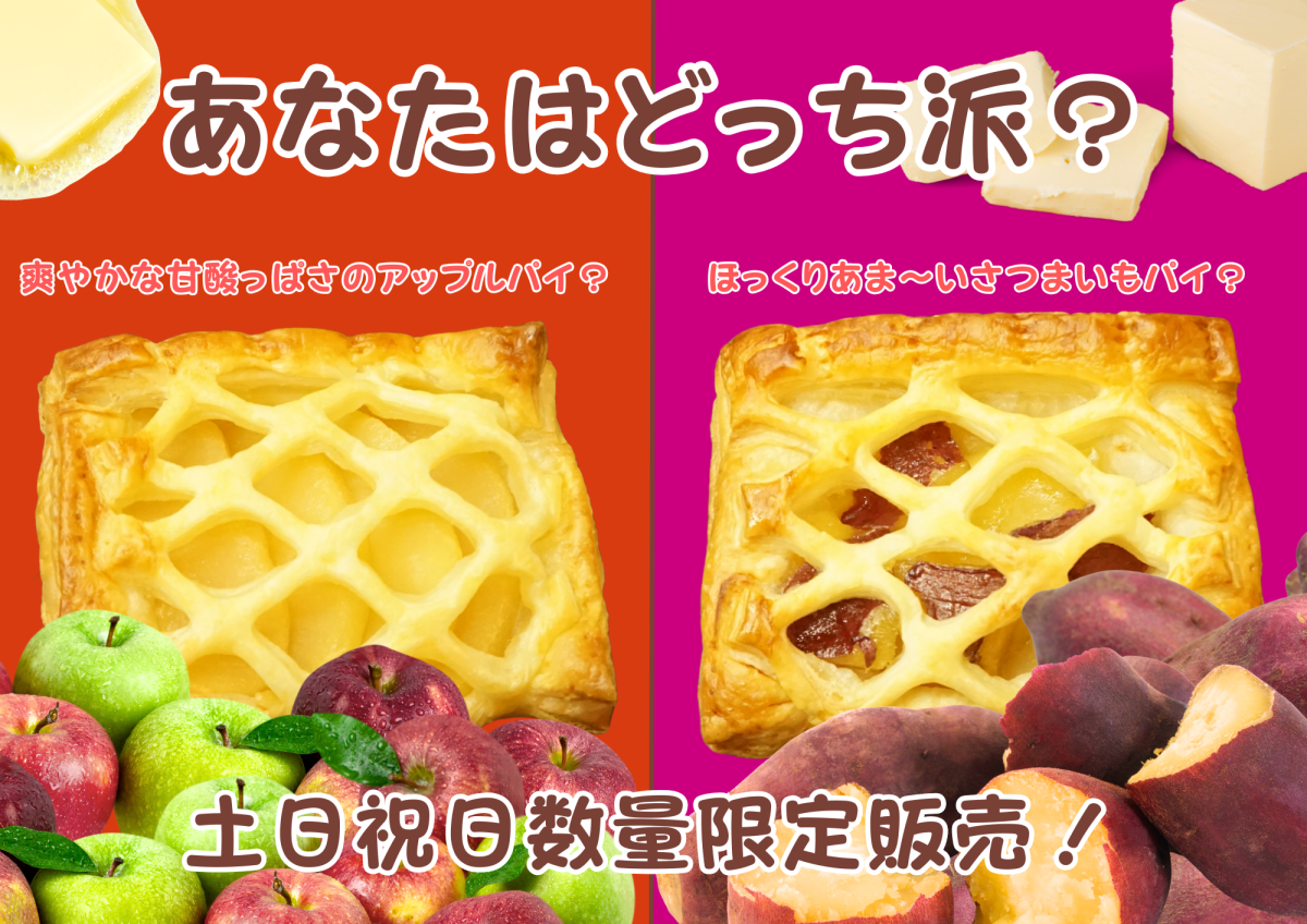 ✨ 土日祝日だけの数量限定販売! サクサクのパイ生地に、季節の美味しさをぎゅっと詰め込みました。 おやつにも、ドライブのお供にもぴったりです🚗💨