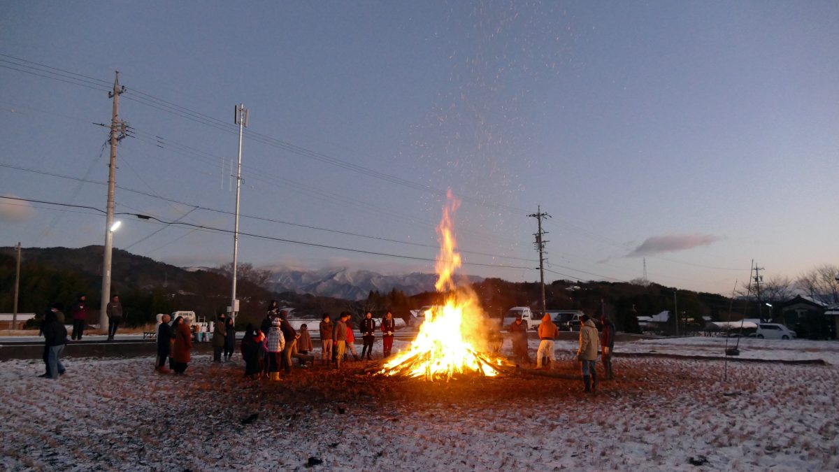 小松原地区のどんど焼き 朝早くの着火後、徐々に夜が明け、遠くに中央アルプスが望めます。