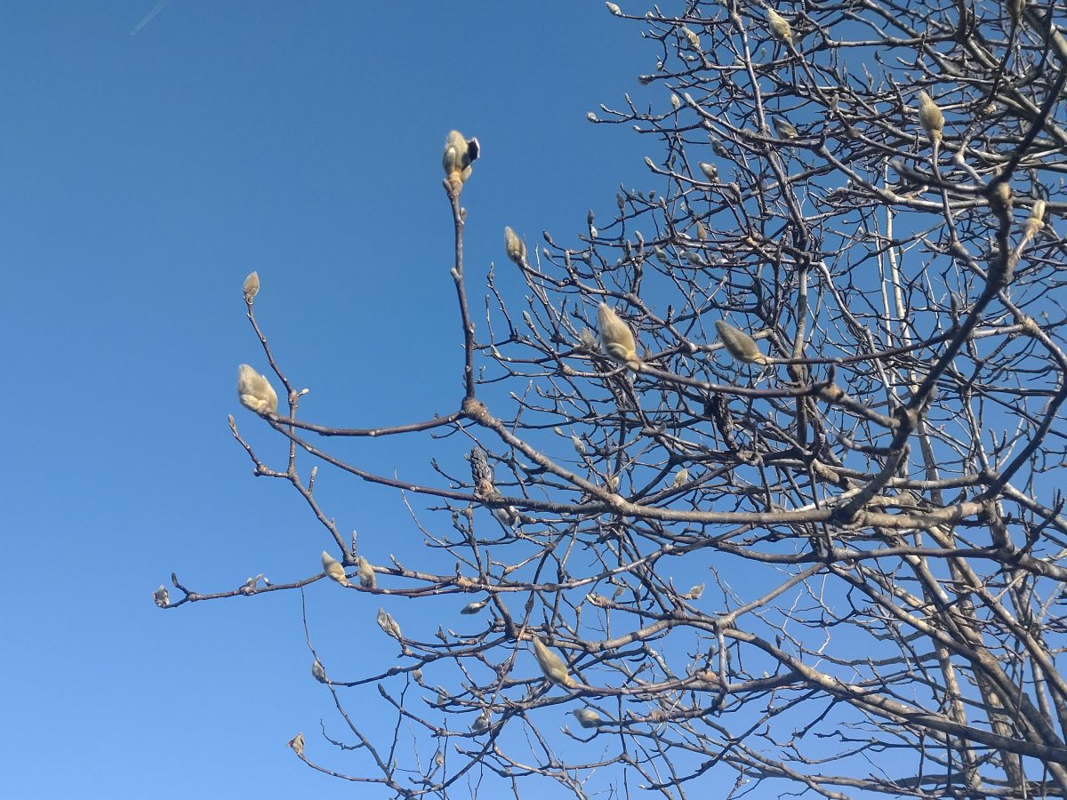 モクレンの蕾が青空に映えています。